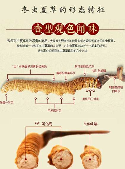 冬蟲夏草在密封后打開,聞起來有淡淡的腥氣味,淡草茹味。總之,冬蟲夏草入藥時須“草、蟲”兼?zhèn)?,藥性方佳,倘若缺一,則療效難全。若遇殘缺不全的蟲草,或只有蟲體而無子座,或只有子座而無蟲體;均為次品,此點最為重要,切勿忘記。在購買藥用冬蟲夏草時,應(yīng)選擇色澤正常、發(fā)育良好、無病蟲害、無殘缺、無畸形、質(zhì)地良好而又干爽者。
